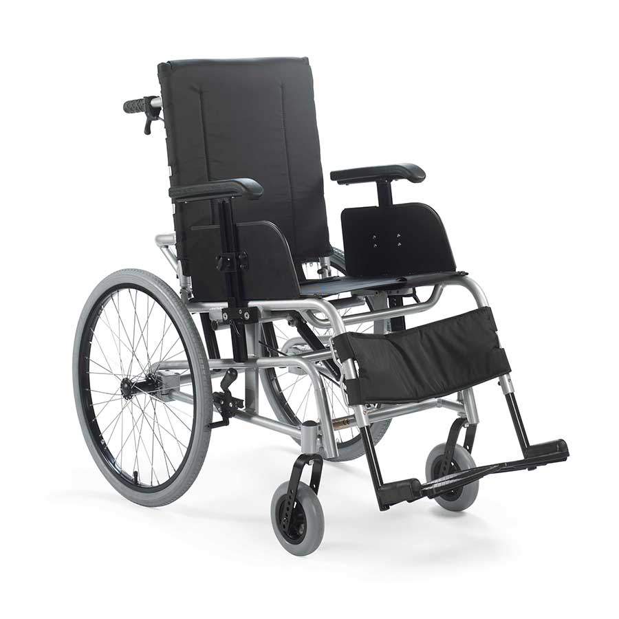 Tilting wheelchair in aluminium. Different back support systems can be applied. It can easily be made smaller for travelling.